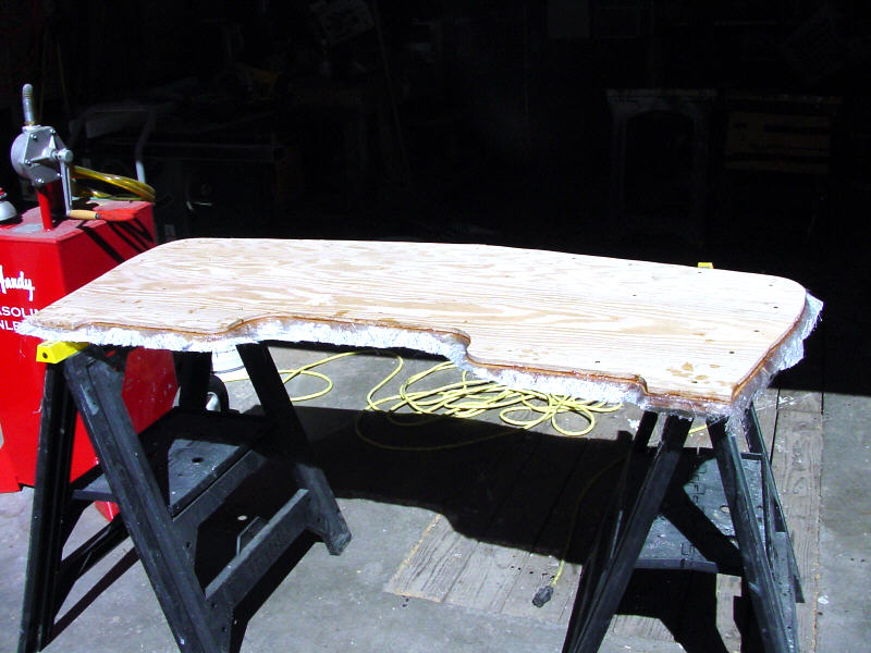 The new transom is a layup of 3/4" and 1/2" marine plywood with a fiberglass mat core.
